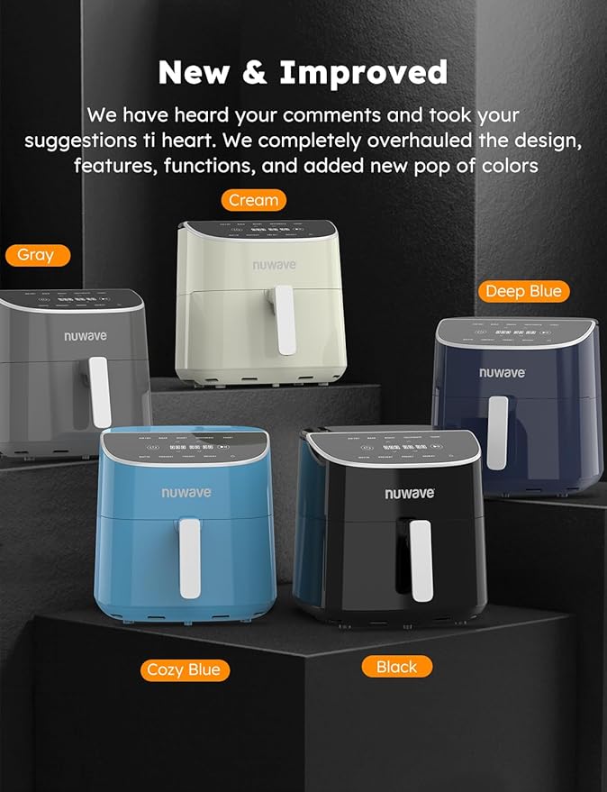 - NEW & IMPROVED – We have heard your comments and took your suggestions to heart. You challenged us to improve on the Brio airfryer. We completely overhauled the design, features, functions, and added new pop of colors. With Brio Plus air fryer, you are well on your way to cooking healthy in style.