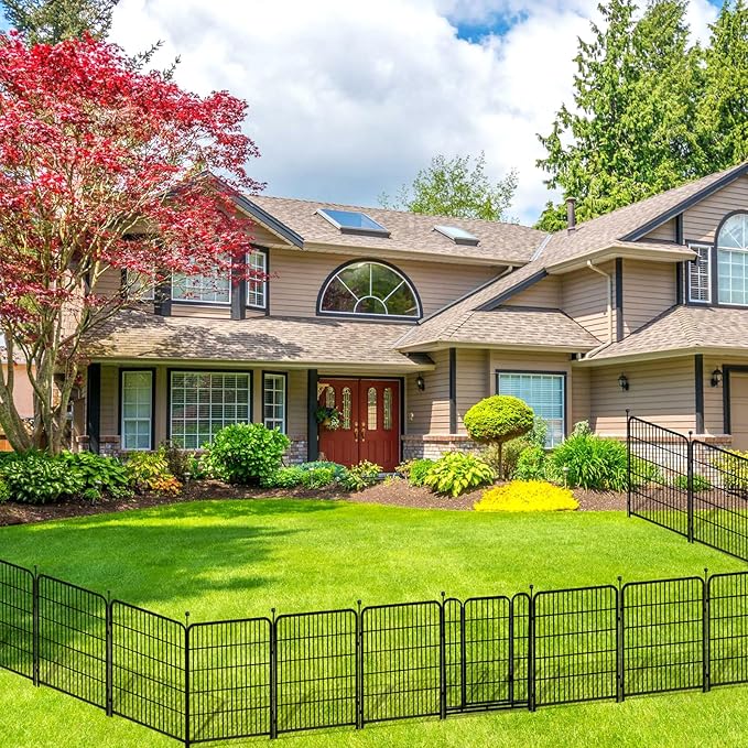 - Design and Improvement: This Garden Fence is Designed Like a Low Gate. It's More Convenient for both People and Small Pets to Come In and Go Out. Each Piece of The Decorative Fence Has an Extra Insertion Bar. So, You Can Splice It into Any Shape without Leaving out A Panel. The Bottom Tip Connection Bar Has been Lengthened to Make It Easier to Insert into The Ground and Provide Greater Stability and Stiffness