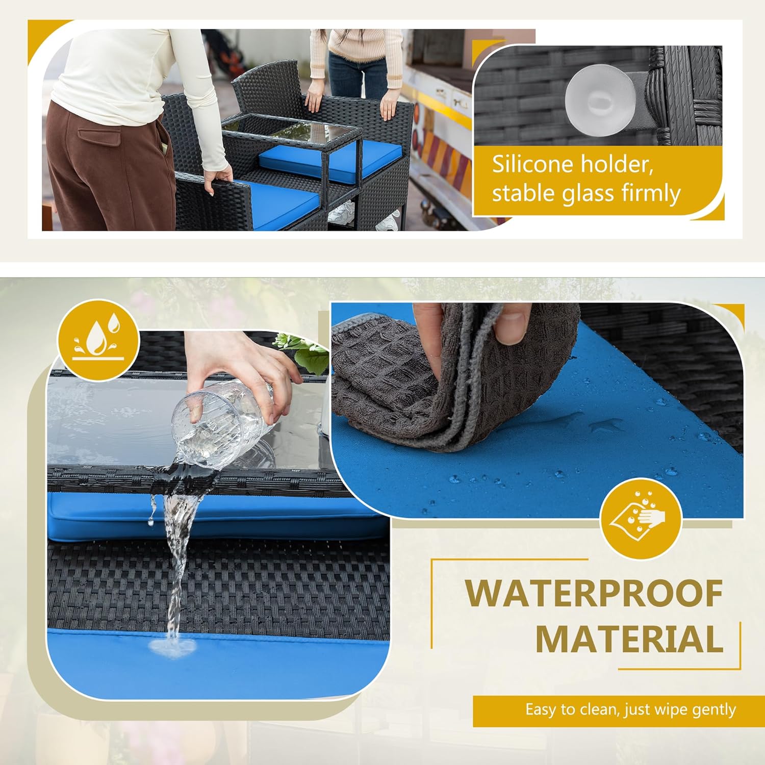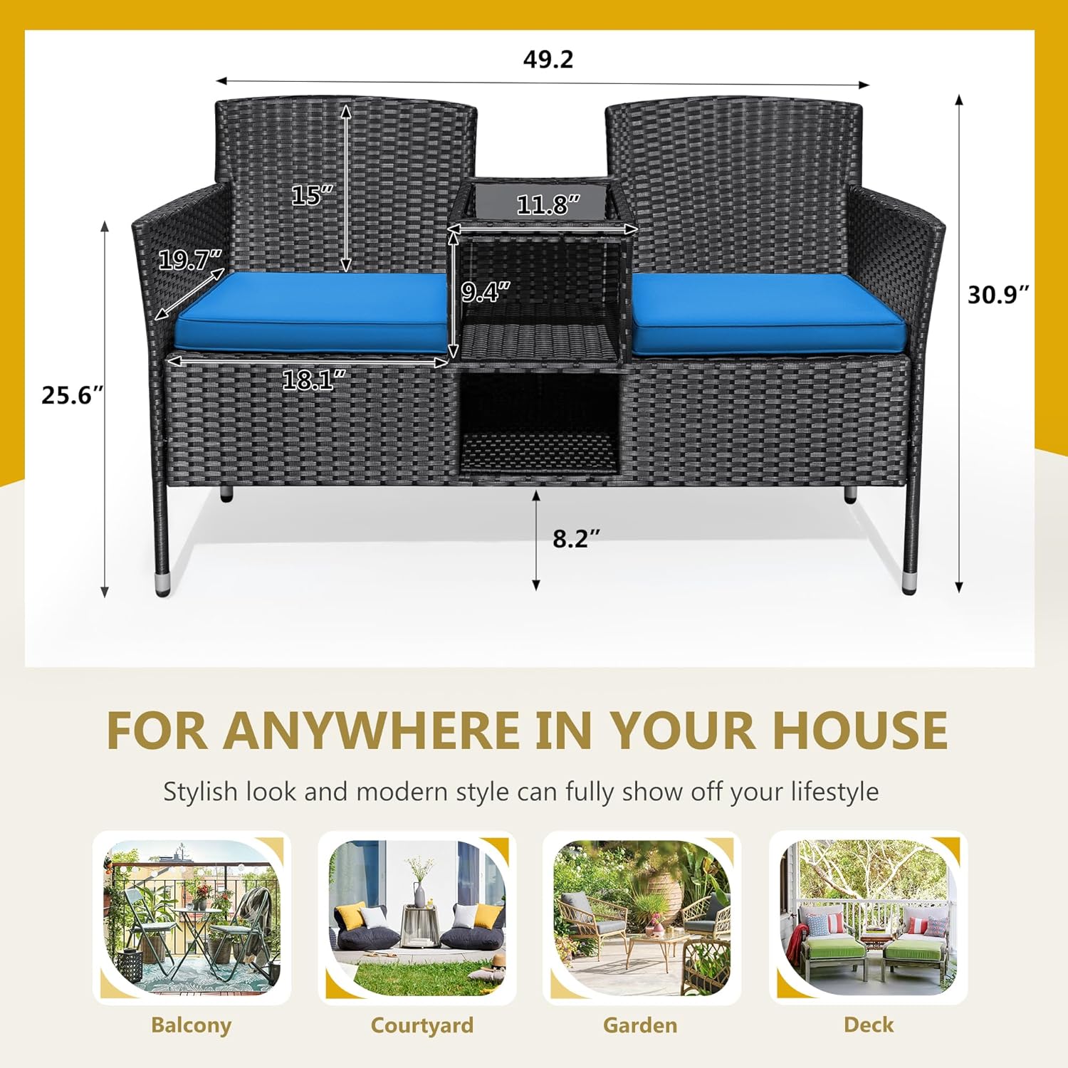 Flamaker Outdoor Furniture Patio Loveseat Wicker 2-Seat with Built-in Table and Cushions Rattan Porch Chairs Bench for Balcony, Lawn, Backyard (Blue)