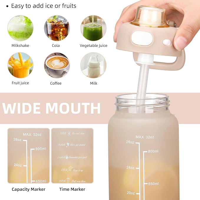 SIEROZUR 32 oz Glass Water Bottle with Straw and Handle Large Sports Motivational Water Bottle with Locking Lid and Time Marker Leakproof Water Jug for Daily Hydration Intake BPA Free