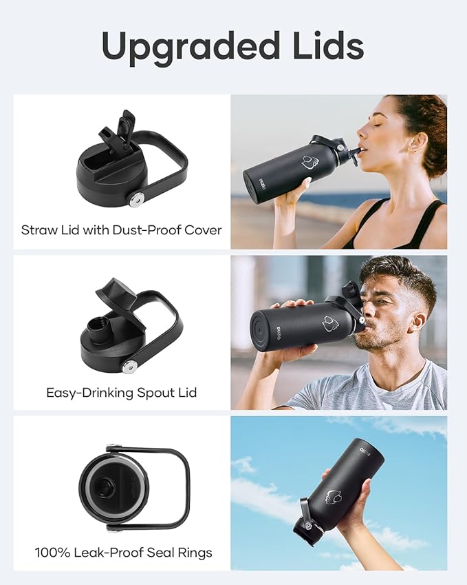 - Upgraded Lids & Handle: This Stainless Steel water bottle features two enhanced lids: a staw lid with dust-proof cover and a easy-drinking spout lid, both equipped with 100% leak-proof seal rings. The reinforced, larger handle offers unmatched durability and portability, making it your perfect on-the-go companion. Also, each lid has a thickened sealing ring, which guarantees 100% leak proof.