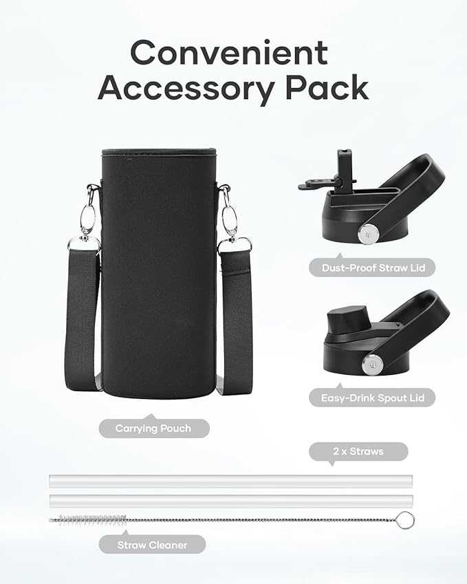 - Accessories & Warranty: With every purchase, you'll get a set of practical accessories and a lifetime warranty. The pack includes 1 x carrying pouch, 2 x lids, 2 x straws, and 1 x straw cleaner. This bottle is ideal for camping, hiking, cycling, running, gym sessions, or outdoor work, ensuring you stay hydrated wherever you go.