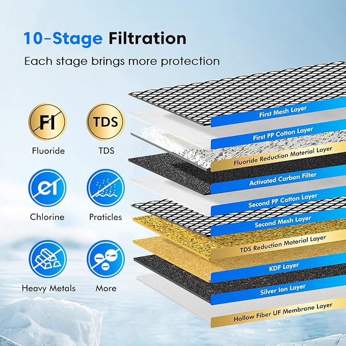 - 10-Stage Filtration - This upgraded filter adopts a composite filter technology, utilizes a 10-stage filtration process, including TDS reduction material, fluoride reduction material, 2 layers of mesh, 2 layers of PP cotton membrane, activated carbon, KDF, silver ions and a 0.01μm hollow fiber UF membrane, to reduce TDS, salt, calcium and magnesium ions, fluoride, chlorine and intercept rust, sediment, organic matter and heavy metals.