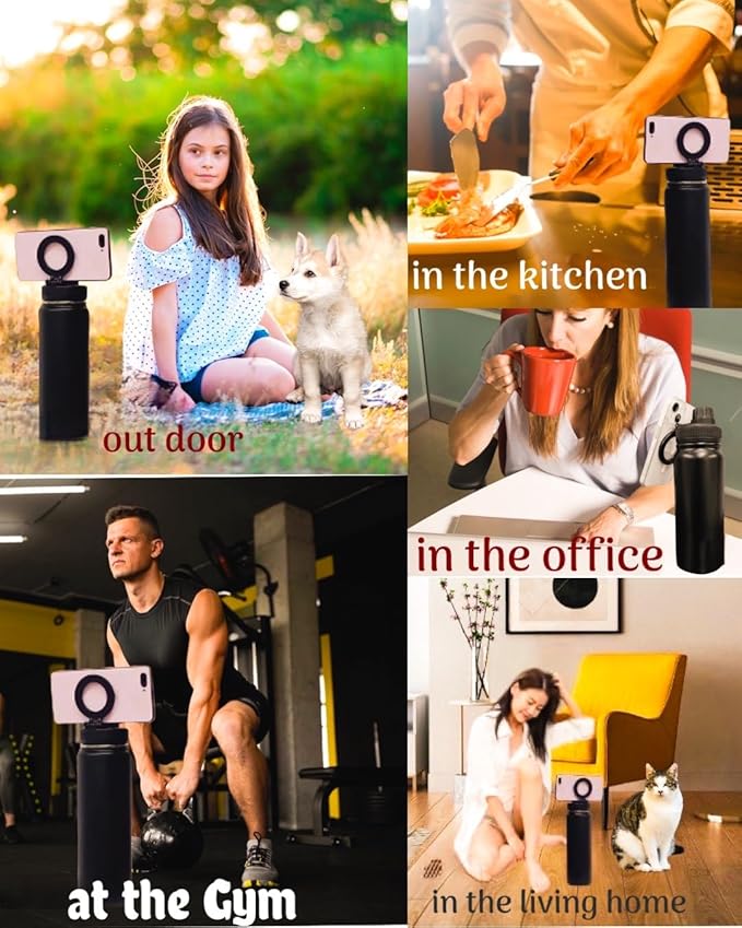 - * Stainless steel insulated water bottle with superior thermal performance * Keeps liquids hot for 12 hours and cold for 24 hours * Durable and high-quality construction for long-lasting use * Sleek and modern design for a stylish appearance * Convenient magnetic tripod phone holder integrated into the bottle's design * Securely holds your phone in place, providing a hands-free experience * Ideal for trips, outdoor activities, and on-the-go adventures * Leak-proof and spill-proof design to prevent messes * Easy to clean and maintain for hassle-free usage * Versatile accessory for staying hydrated and capturing moments with your phone effortlessly.
