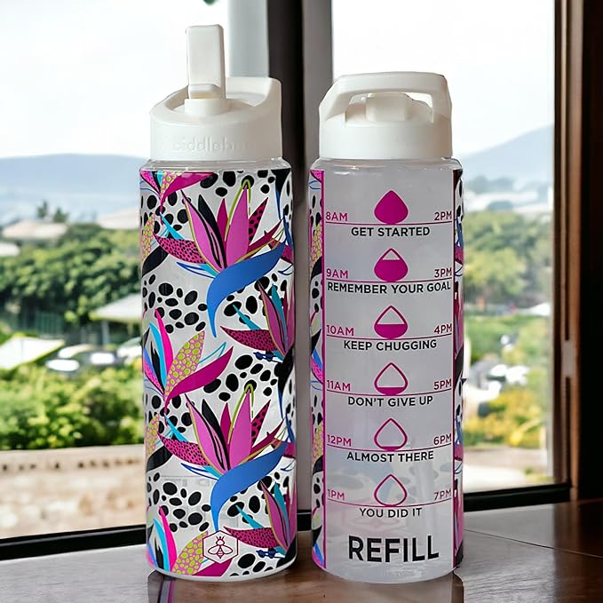 - Daily Water Intake Bottle: The Biddlebee Hydration Tracker reusable water bottle features easy to read time markers on the bottle to help you track your daily intake! Motivational sayings encourage you to stay hydrated throughout the day and reminds you to refill halfway through the day. The water tracker bottle comes with a gift box and is perfect for home, work, or the gym and can be used by women or men. Using a water bottle that tracks water intake will help you to hit your health goals.