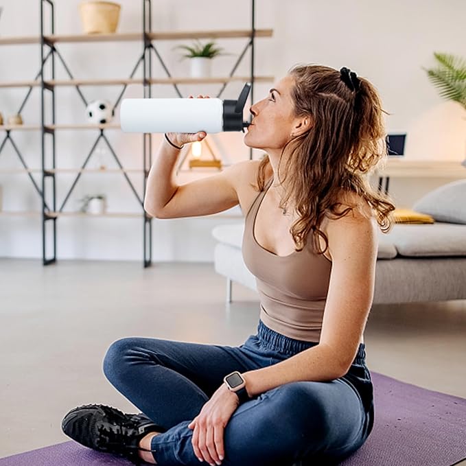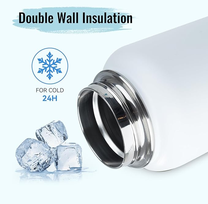 Stainless Steel Water bottle with Straw & Wide Mouth Lid, Wide Rotating Handle, 32oz Double Wall Vacuum Insulated Water Bottle Leak Proof, BPA Free, Keep Cold and Hot, 32oz, White