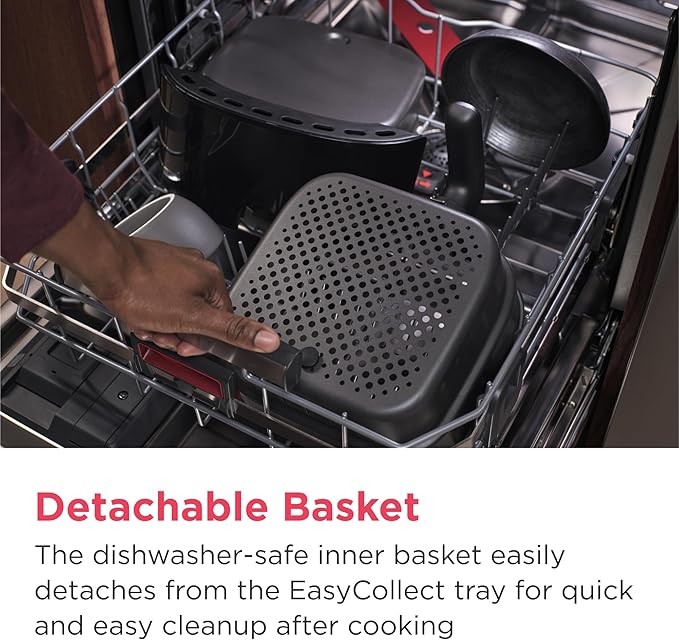 - Easy-to-Clean Basket: The dishwasher-safe inner basket easily detaches from the EasyCollect tray and features a durable non-stick coating for quick and hassle-free cleanup after cooking