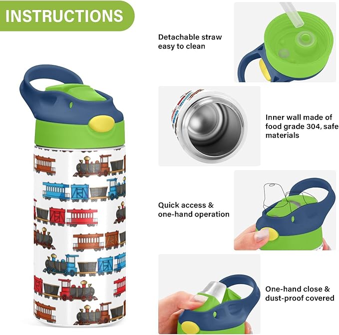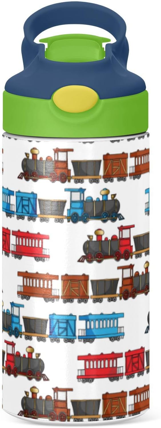 Colorful Truck Trains Railroad Kids Water Bottle with Straw Insulated Stainless Steel BPA-Free Sport Bottles for Boys Girls Toddlers 12 oz Green Lid