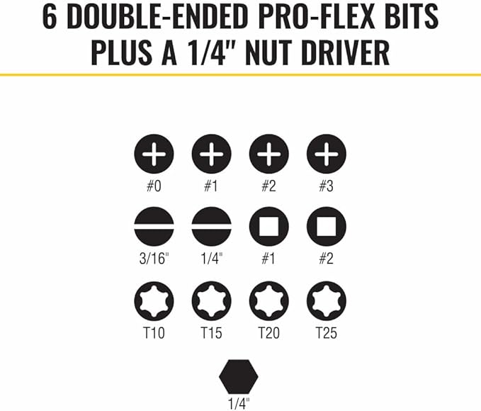 - INDUSTRIAL STRENGTH BITS: #0, #1, #2, #3 Phillips, 3/16-Inch, 1/4-Inch Slotted, #1, #2 Square, T10, T15, T20, T25 TORX and 1/4-Inch Hex