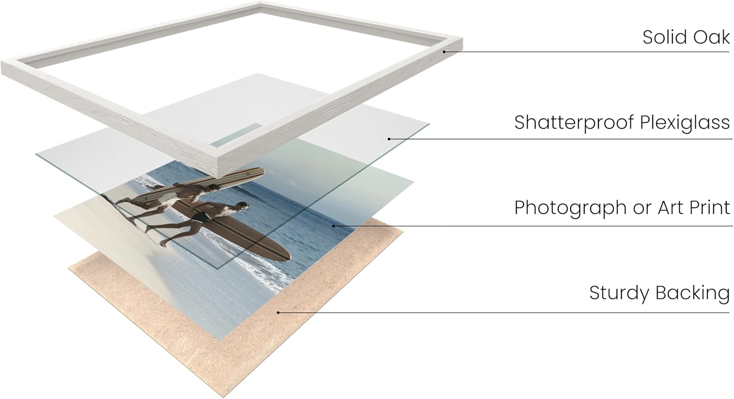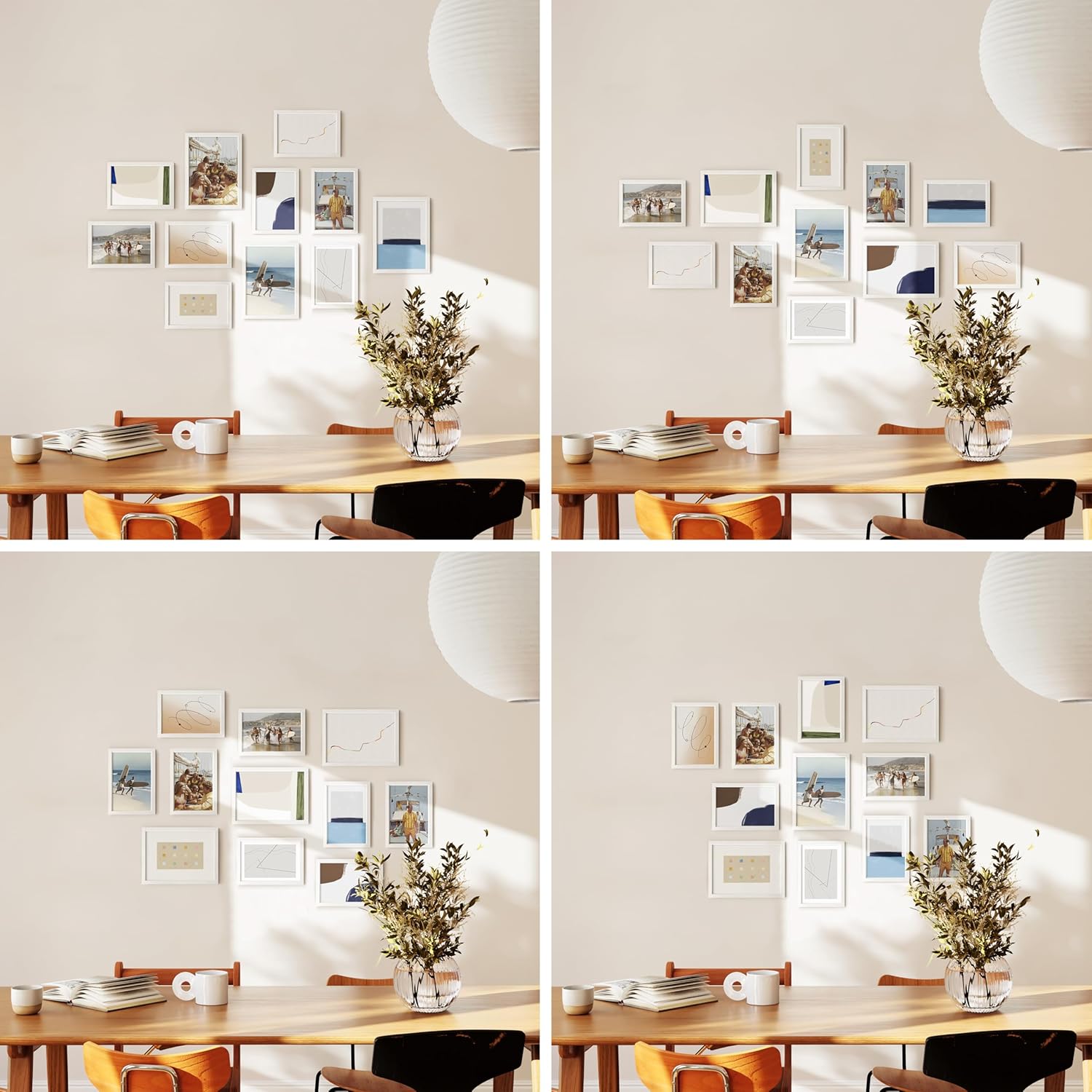 - PREMIUM WALL ART: Our tabletop picture frames will add the finishing touch to your art or photograph. They're equipped with plexiglass covered by protective film and two metal hangers for horizontal or vertical hanging. For added convenience, our white gallery wall frame set is shipped in a durable box, securing their protection throughout transit