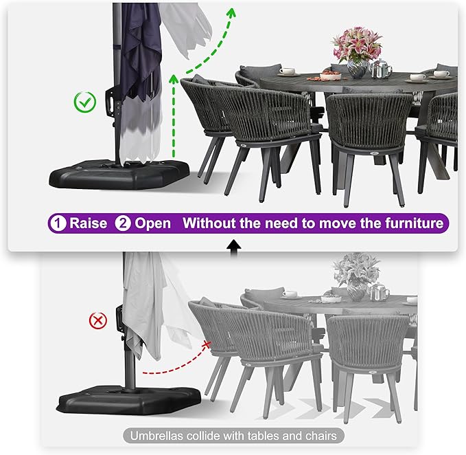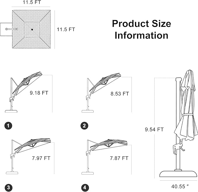 - Five-level Adjustment & 360° Rotation: The crank system of this cantilever umbrella makes it easy to raise and lower the canopy, the unique handle design also makes tilting the patio umbrella effortless, foot pedal allows for complete 360 degree rotation