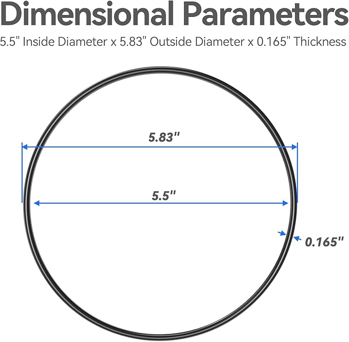 - The dimensions of these o-rings are approximately 5.5" Inside Diameter x 5.83" Outside Diameter x 0.165" Thickness. Please confirm the required O-ring size before purchase.(If your product manual calls for the 151122 o-ring part number or one of the other part numbers listed below, it can be used.)