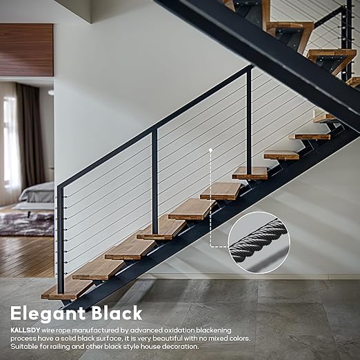 - Elegant Black: KALLSDY black wire rope manufactured by advanced oxidation blackening process have a solid black surface, it is very beautiful with no mixed colors. The low-absorbing feature help the railing wire blend in with its enviorment, adding a unique elegant aesthetic to your house
