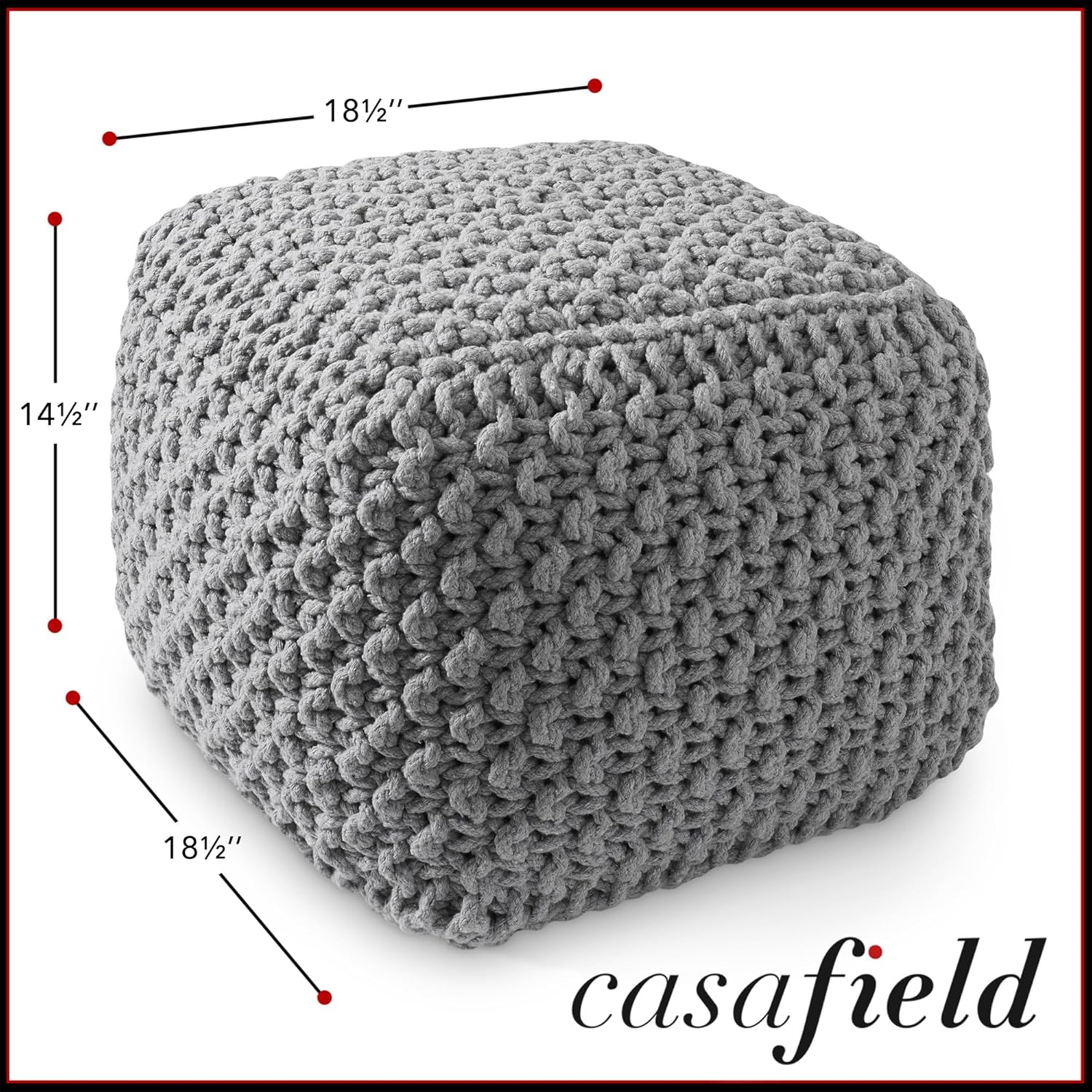 Casafield Square Pouf Ottoman, Light Gray 18.5" W x 18.5" D x 14.5" H Cotton Knit Foot Stool - Boho Floor Pouffe for Living Room, Bedroom, Home Office