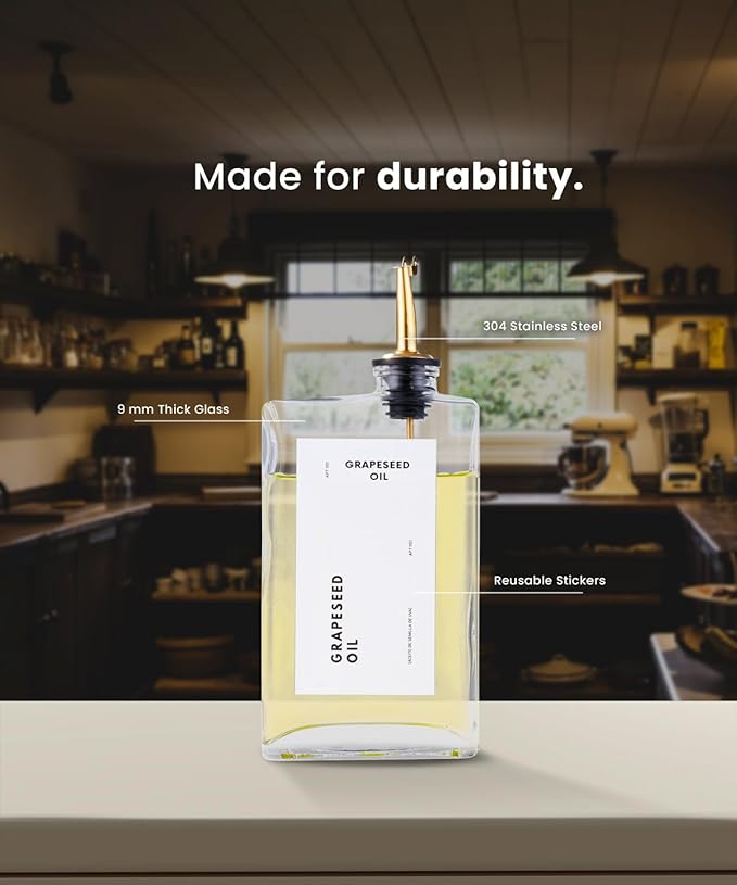 - Gift. Oil dispenser bottle for kitchen is the perfect gift for your loved ones. It comes with three colors: gold, silver and black for your choice. Get our oil holder for kitchen today!