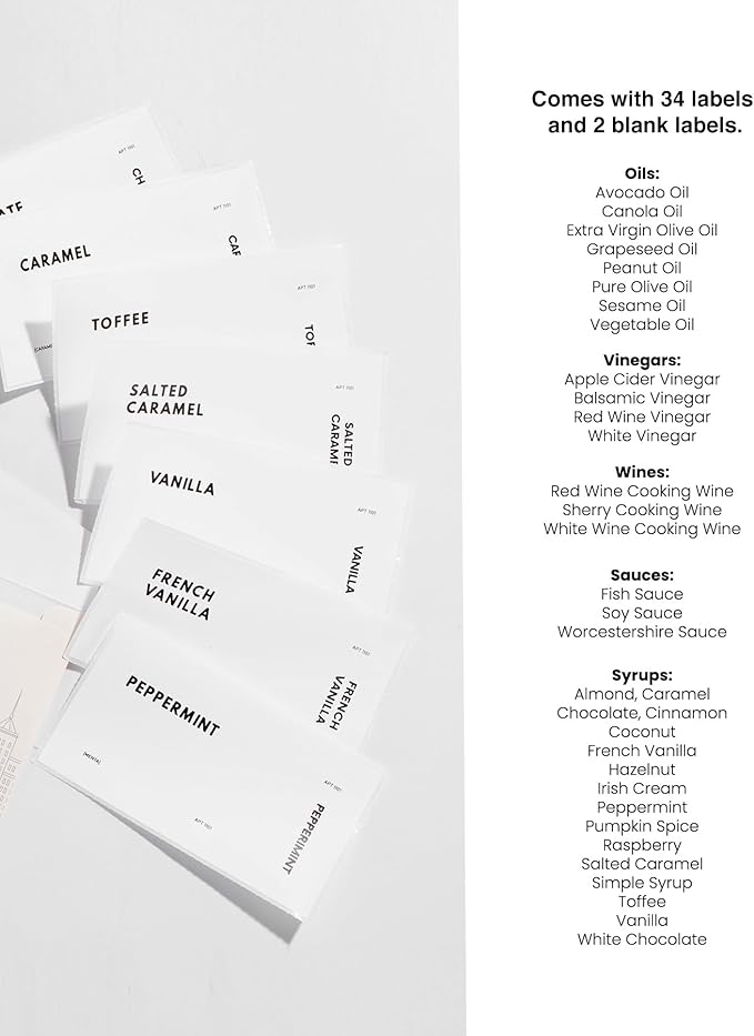- Versatile Usage. Use it as a drizzle olive oil container, vinegar dispenser, soy sauce bottle, coffee syrup bottle or vinegar and oil dispenser set — this olive oil bottle dispenser suits various needs. It also comes with a 36 designed water-proof, weather-proof label set for your custom use.