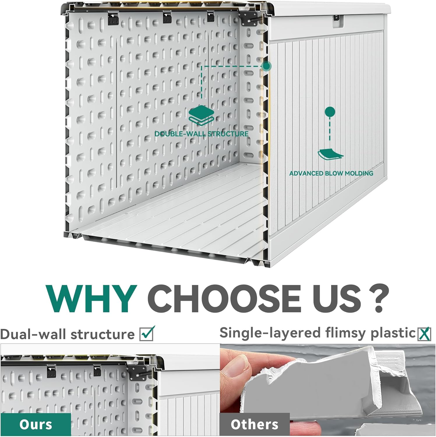 - DOUBLE-WALL CONSTRUCTION:Unique dual wall structure raises sturdiness & durability to the next level; All-weather guard resin pairs with wooden texture to impart a sleek texture for lasting outdoor use