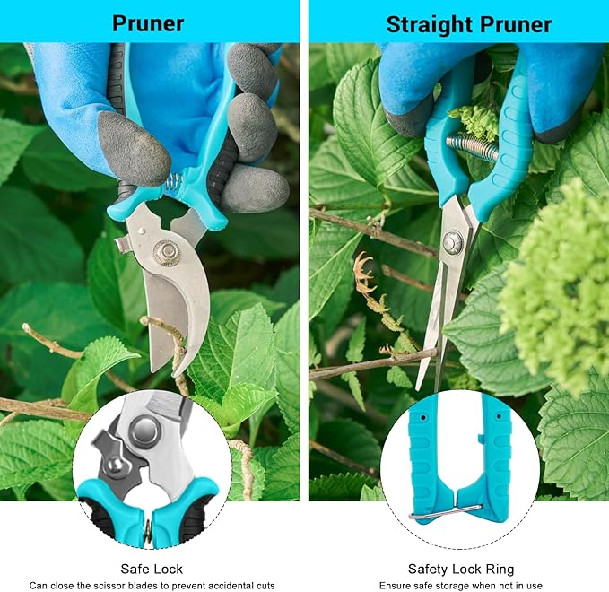- COMPLETE 11 PCS GARDENING TOOL SET - This all-in-one gardening set with 11 essential tools will meet all your gardening needs. It features a pruner, cultivator, soil scoop, small trowel, hand rake, weeder, pruning shears, crevice weeder, gardening gloves, pruning snips, large repotting mat, and an Oxford cloth tote bag. With these tools, you can efficiently perform tasks such as pruning, digging, weeding, aerating and planting