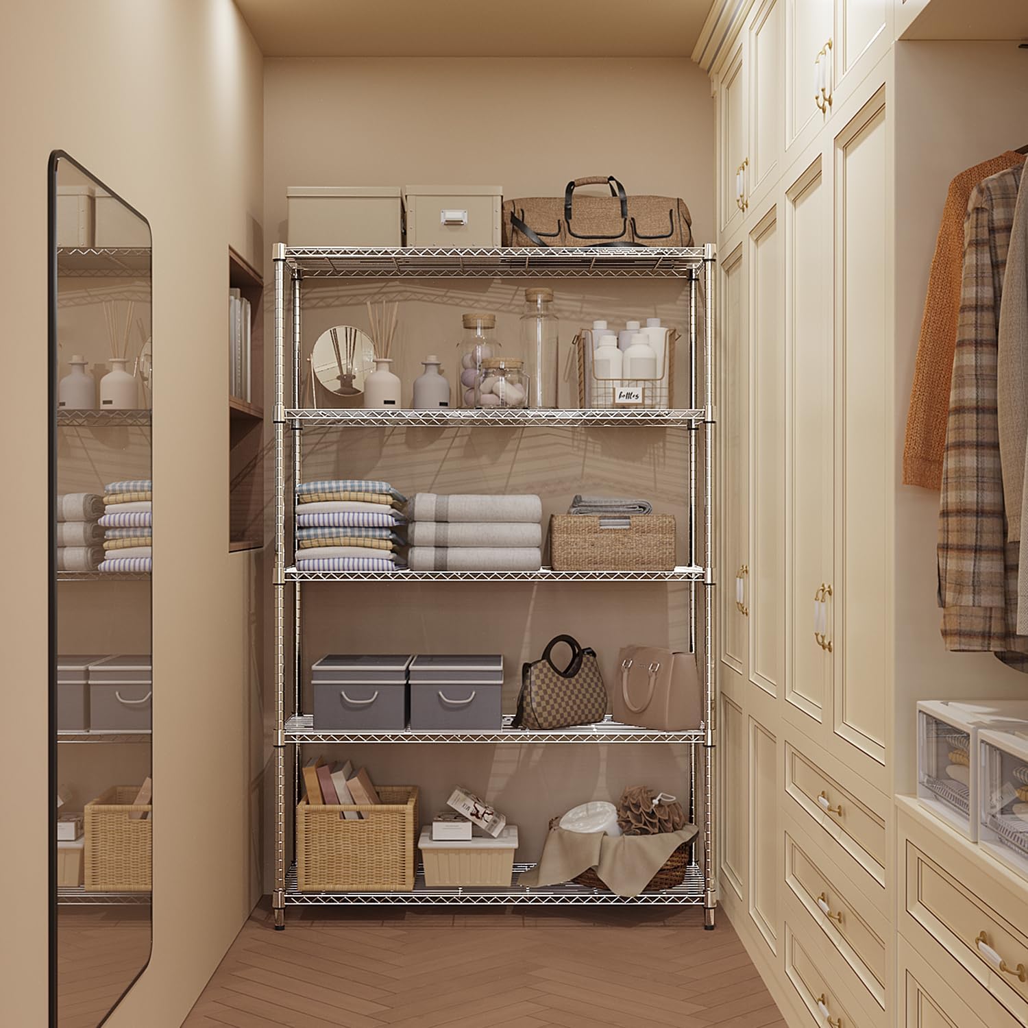 MZG 1750 lbs 5 Tier Storage Rack Metal Wire Shelving Unit, Storage Standing Household Shelf Organizer for Kitchen Pantry Closet Garage Basement Utility Room, Chrome 15.8" D x 45.3" W x 70.4" H