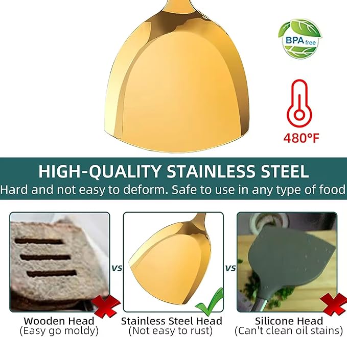 Generic Stainless Steel Kitchen Utensil Set, Spoon, Spatula, Pasta Server, Small Spatula (Black & Gold)