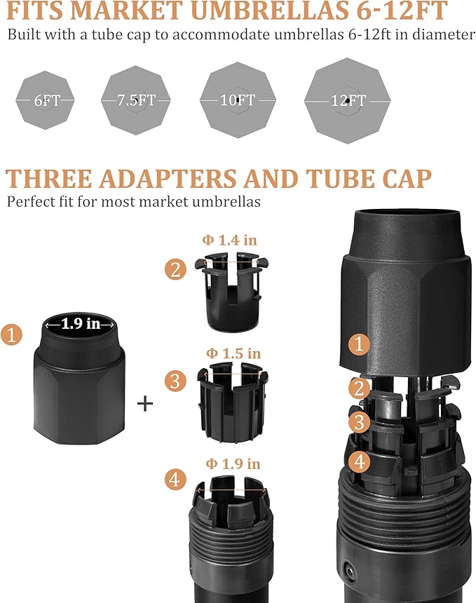 - Fits 1.4 to 1.9-inch Poles: Includes 3 adjustable knobs to perfectly suitable market umbrella poles of different sizes.