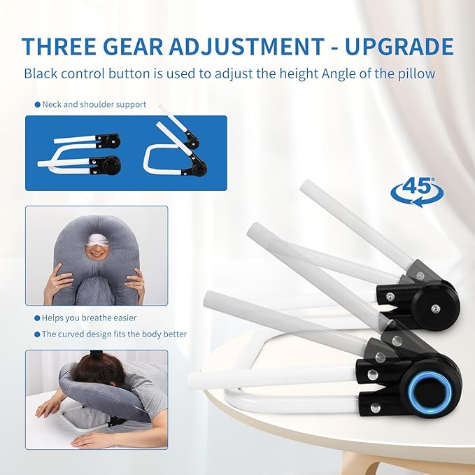 - New Upgraded Face Down Pillow - Our after-surgery pillow has been modified and improved many times, with a reinforced bracket and three-level adjustment to provide the most comfortable face-down pillow. The face pillow includes cotton filling and has an invisible zipper to adjust the cotton according to your needs, keeping it soft and comfortable when you use it.