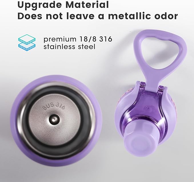 - Made of 18/8 316 food grade stainless steel, the water bottle is durable, it will never leave a metallic taste or rust. Portable carrying handle design makes it easy to carry around on a daily basis. Its wide mouth opening makes filling and cleaning your ice cubes quick and easy.