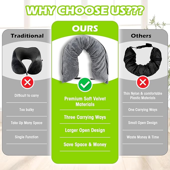 - 【 Save Your Money & Space 】Our stuffable travel neck pillows are deisgned to carry items that don't fit into one's carry-on or personal item without paying extra up to $70 extra checked baggage fees,give it a try-you won't regret it,this not only helps store more clothes for a trip,it doesn't cost anything to bring it on a trip with You. Great purchase for a traveler