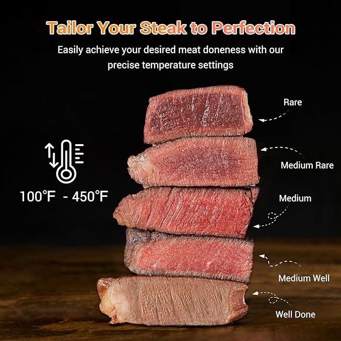 - [Perfection Consistency ] Equipped with a dual-sensor thermometer and see-through window, our SensorMagic smart air fryer automatically monitors the meat temperature to deliver perfect results every time. The 3-speed fan airflow system ensures every meal is golden, crispy, and juicy, delivering delicious food faster.