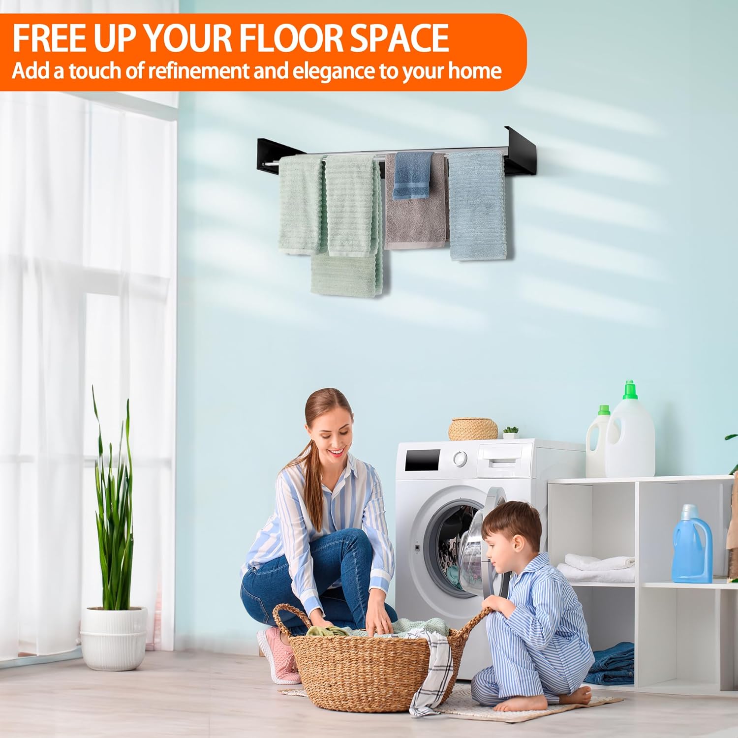 FOCHIER F Laundry Drying Rack Wall Mounted Clothes Drying Rack Collapsible with 5 Aluminum Rods and Drilling Template Long Screwdriver Bit 60 lbs Capacity (Black, 31.5")