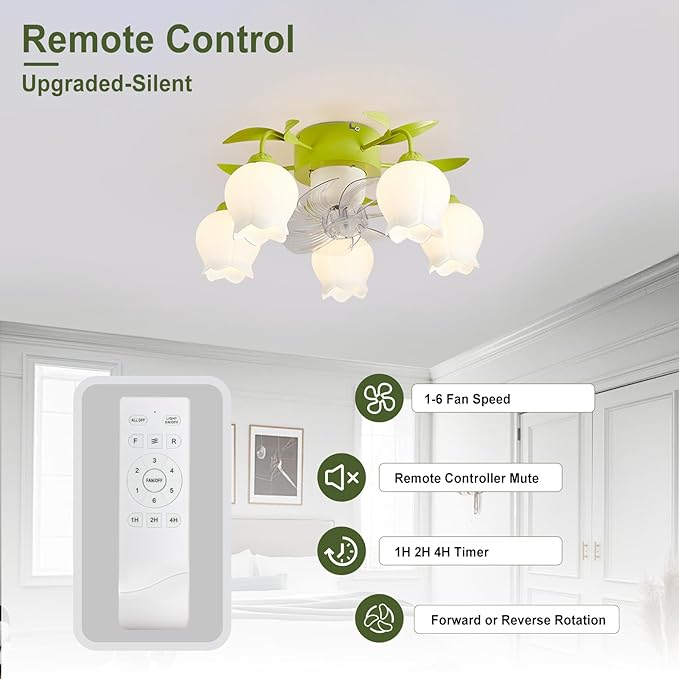 - Low Profile Fandelier with Remote Control: You can operate all the functions by the remote, like 6 wind speeds setting, 1/2/4H time setting; Reversible mode is operated through remote control, fan or lighting can be turned on separately; it's also allowed to turn the light on and off with your wall switch; low profile flush mount ceiling fans with lights save worry and energy;