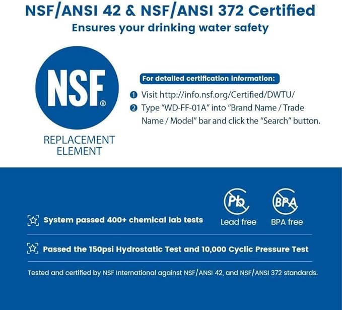 - NSF certifications: Tested and certified by NSF International against NSF/ANSI standard 42 for the reduction of chlorine, taste and odor, and to NSF/ANSI 372 for lead-free material. Provides you with safer and healthier water.