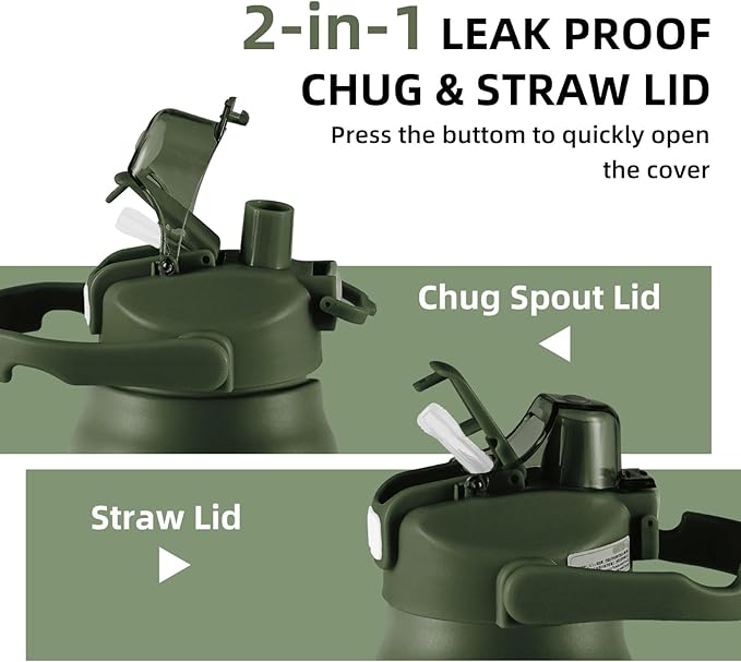 50oz/1.5L Insulated Sports Water Bottle, Stainless Steel Double Wall Water Jug with Handle, 2-in-1 Chug Spout and Straw Lid with Lock Cover for School, Outdoor, Sports & Travel, Army Green