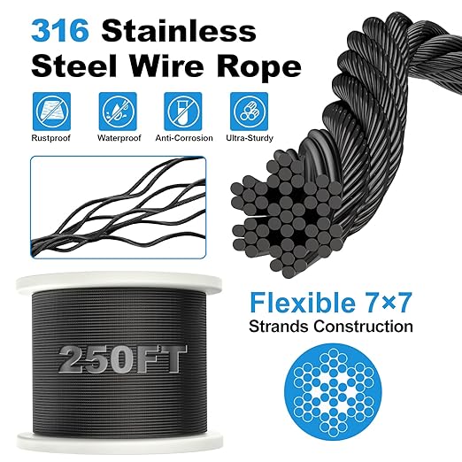 - [Marine Grade Black Finish] - Our black stainless steel cable features innovative marine grade electroplating technology, ensuring a long-lasting black color that outperforms standard black-oxide coating wire cables. Backed by a 5-year warranty for peace of mind.