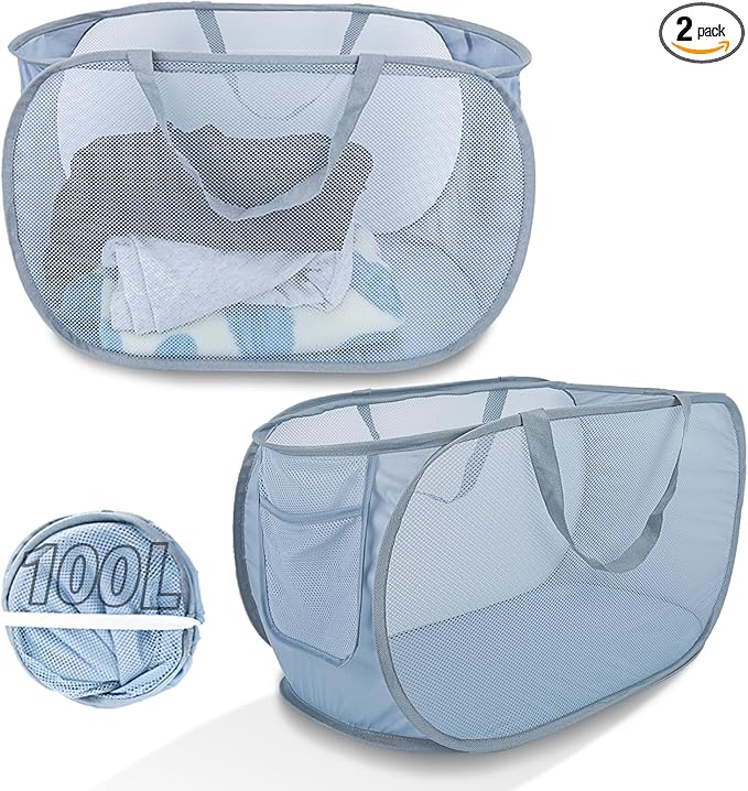 Extra Large Mesh Pop Up Laundry Hamper 2 Pack, 100L Foldable Laundry Baskets, Dirty Clothes Hamper with Pocket, Collapsible Hampers for Travel, Nursery, Dorm or Home. Grey 2H
