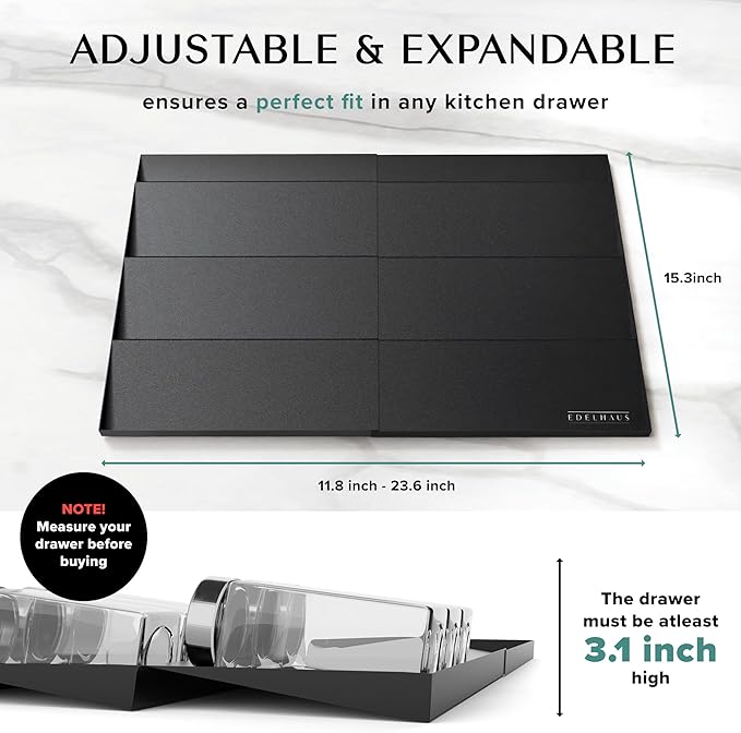 - EXPANDABLE SPICE RACK FOR DRAWER: Our spice rack drawer organizer consit of 2 pieces and adjusts from 11.8" to 24" wide, fitting most drawers and cabinets. Each spice drawer insert measures 11.8W x 15.4L x 1.1H inches.