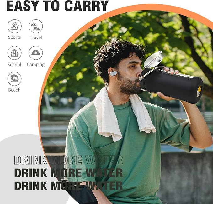 - Glass Water Bottle with Straw Lid: Our 64 oz glass water bottle, furnished with a convenient straw lid, showcases an innovative and fail-safe design. Its pioneering one-click button system simplifies the drinking process—just a gentle press and the lid opens automatically, ensuring a hassle-free experience.