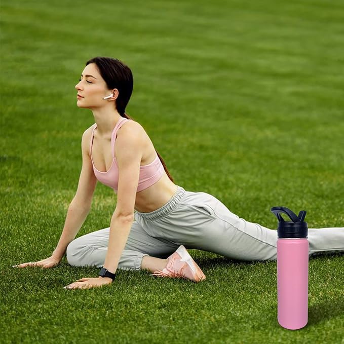 4pack 22 oz Insulated Water Bottle With Straw, Stainless Steel Sports Water Cup Flask with 2 Lids, Wide Mouth Travel Thermal Mug,Pink
