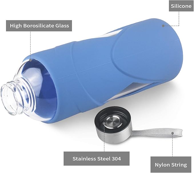 - ๐ PREMIUM GLASS WATER BOTTLE: Our glass water bottle is made of 100% high borosilicate glass which can withstand extremely high and low temperatures. This cute glass bottle will perfectly preserve water, tea or any infused or carbonated drink and keep it fresh for longer!