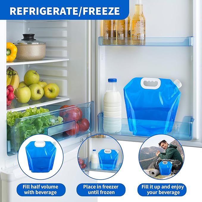 - Wide uses : This No-Leak Freezable Collapsible water container Bag wide range of uses, Simply fill the bag halfway with water & freeze, as portable ice bag for other beverages such as milk, juice & wine, It's perfect for Camping BBQ, travel, RV, Car emergencies & natural disasters like hurricane, tornado, earthquake & floods.