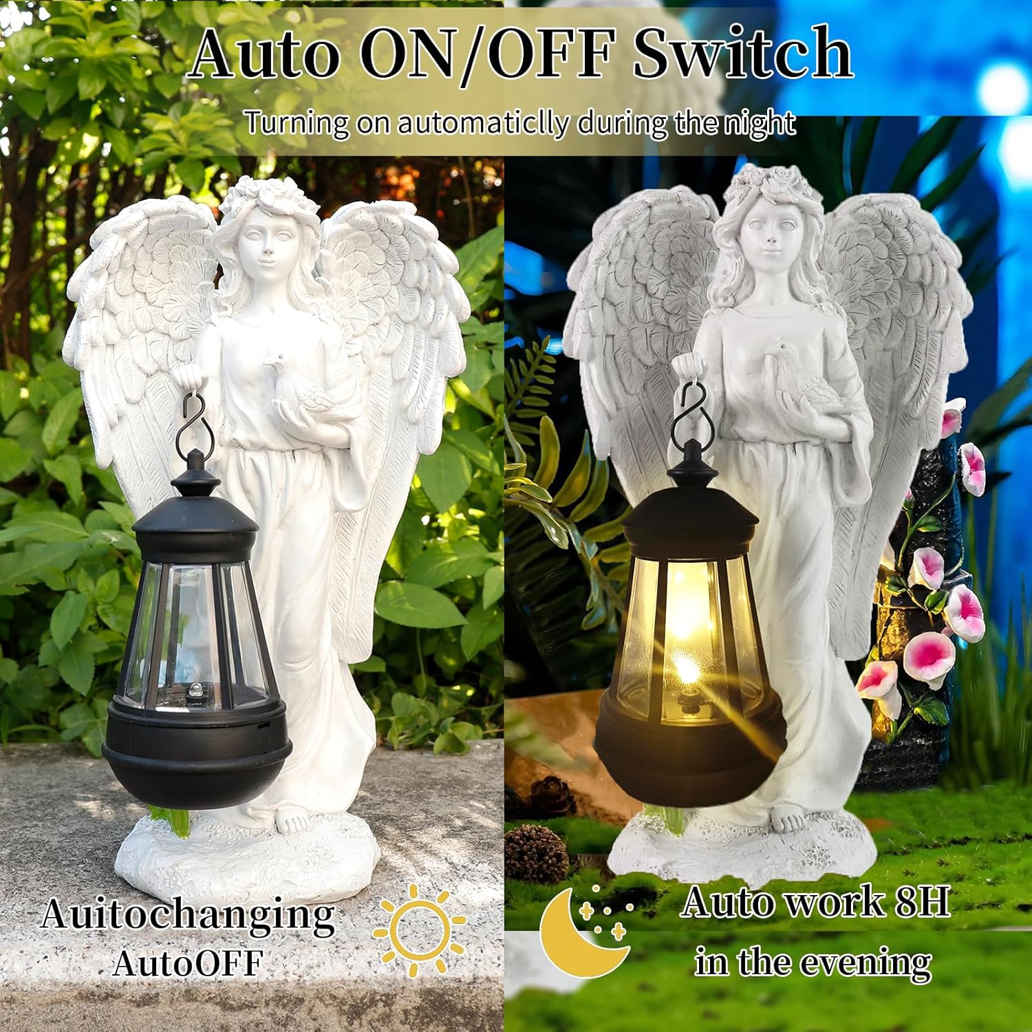 - ♥️【Easy to Use】Powered by Solar Light,Just turn the bottom switch to "ON" to start the timer automatically. The solar panel will then charge, and your angel statue will light up automatically at night, creating a hassle-free outdoor decoration experience.