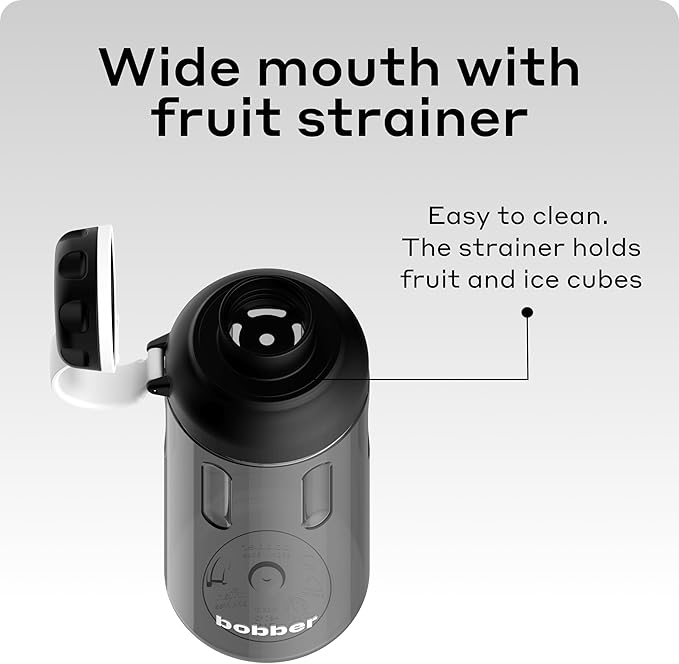 - WIDE MOUTH & FRUIT STRAINER: Easy to clean and refill. A built-in fruit strainer, allowing you to infuse your leak proof sports water bottle with fruits, berries, herbs and ice cubes