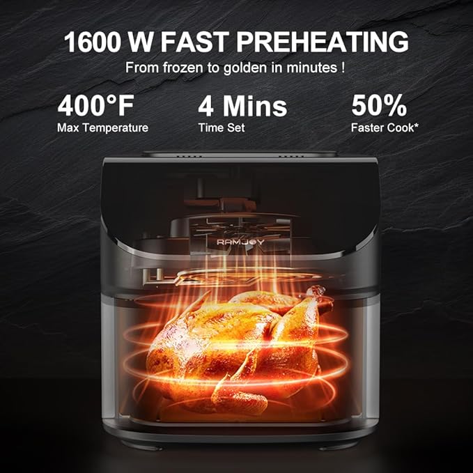 - FAST PREHEATING: From frozen to golden in minutes! Create gourmet meals by airfryer with the versatility of a temperature range of 100 to 400°F, which allows you to gently remove moisture from foods or quickly cook and crisp foods with RAMJOY 1600 watts high power system.