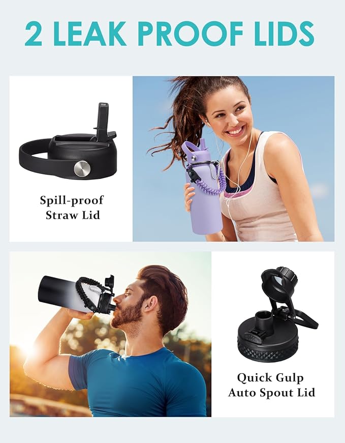 - LEAK-PROOF 2 LIDS - AUTO SPOUT LID & STRAW LID allow you enjoy spill-proof sipping and fast drinking to meet your different drinking needs. The pop-up spout lid is designed for one-hand open and close, with a large water outlet for fast drinking. The spill-proof straw lid makes you easy sip on the go, great to all your outdoor adventures, and also prevent the inhalation of ice cubes