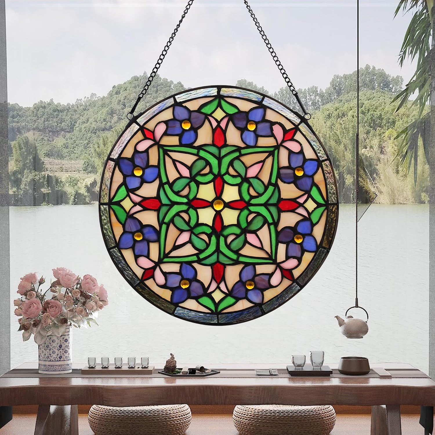 - This 12-inch round window panel is meticulously handcrafted by skilled artisans, with each glass piece carefully cut and assembled. The intricate patterns and vibrant colors give each panel a unique, artistic appeal, making it a stunning addition to any space.