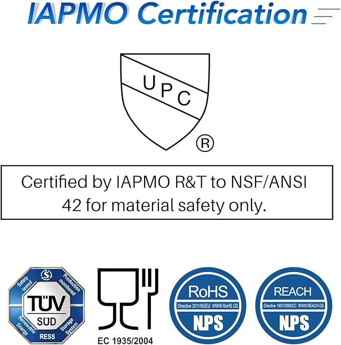 - Authoritative Certifications - This filter bears significant Authoritative Certifications on markets, such as NSF / ANSI 42 for Material Safely from IAPMO, European Food Grade Regulation EC-1935/2016, ROHS, REACH, BPA-Free, TUV, and Australian Water Mark. Choose a high-quality filter to enjoy clean water. Suitable for purifying tap water and well water.