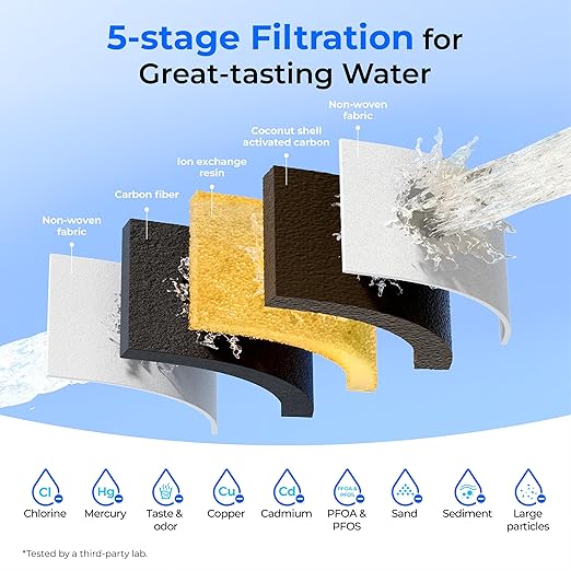 - [5-stage Filtration for Cleaner Water] This water filter pitcher adopts 5-stage filter materials including advanced carbon fiber, ion exchange resin and activated carbon block, and can efficiently reduce chlorine, mercury, taste&odor, copper, cadmium, PFOA&PFOS, sand, sediment and large particles, tested by a third-party lab, offering pure, refreshing water for you and your family. Note: This system DOES NOT lower TDS value.
