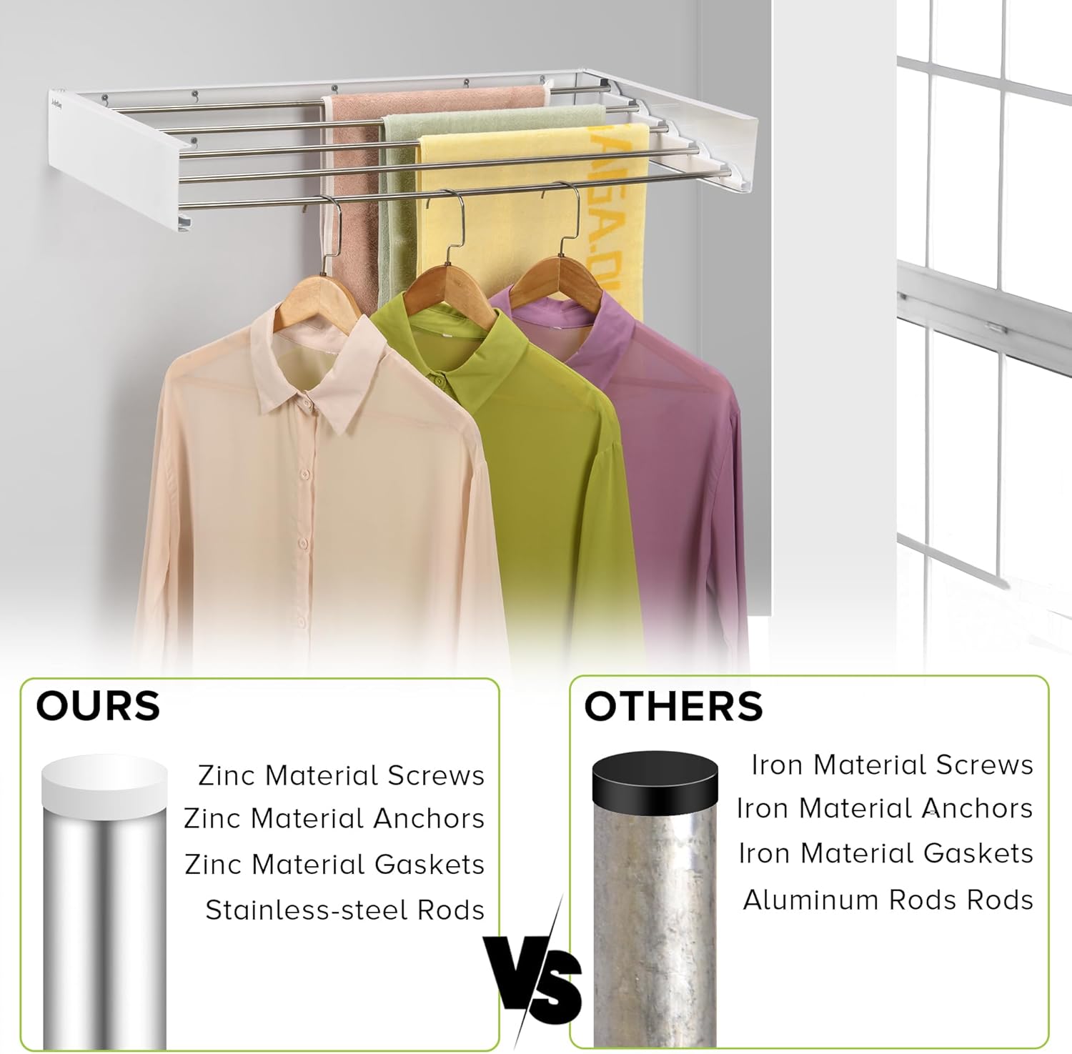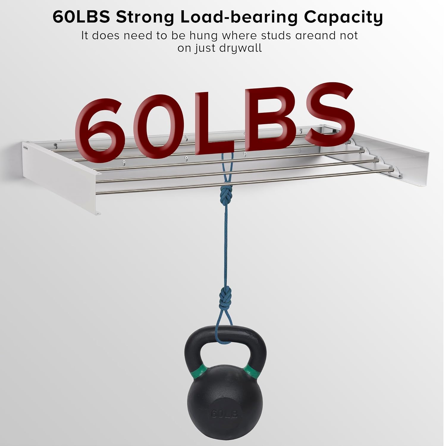 Wall Mounted Laundry Drying Rack, Retractable Clothes Drying Rack for Bathroom with Wall Template, 5 Stainless Rods Heaving 60 lb Capacity (White, 31.5")