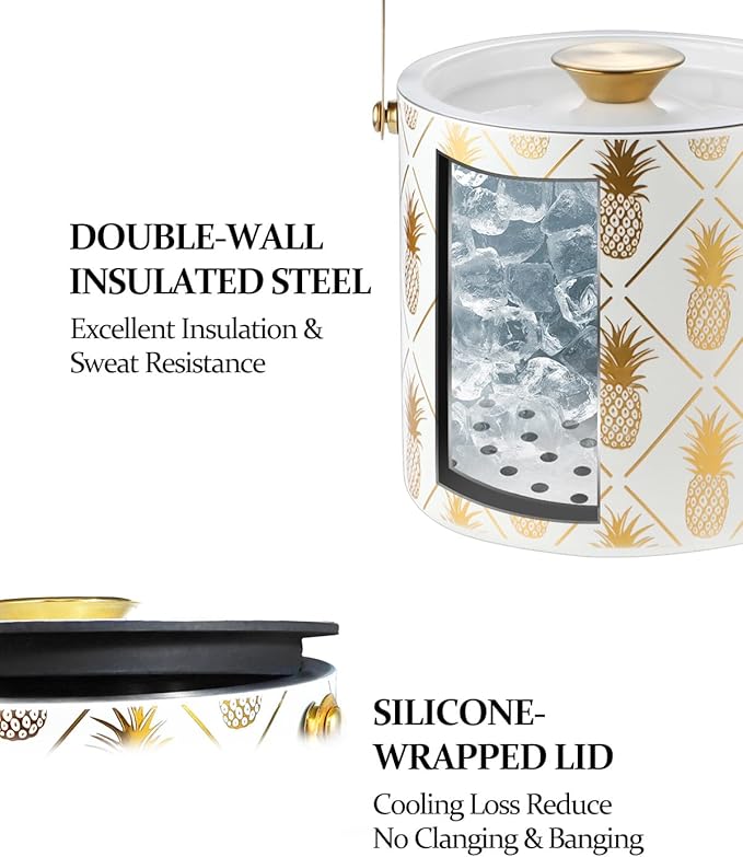 Ice Bucket for Parties with Lid, Strainer & Gold Ice Tongs, 3L Stainless Steel Insulated Champagne Buckets for Cocktail Tiki Bar, Pineapple Embossed White Ice Container Wine Drinks Chiller