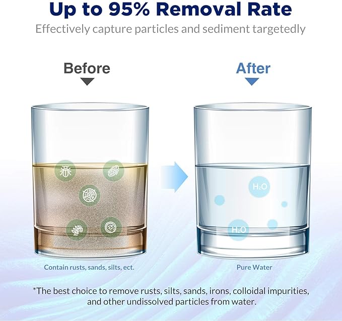 - [PROTECT WATER EQUIPMENT] - The water filter cartridge is the first line of defense in the filtration system, it can effectively prevent the clogging of water pipes and prolong the service life of water equipment. Please note this filter can't remove chlorine to improve water taste.